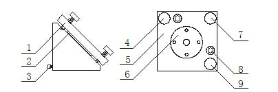 1.反射鏡調整板 2.反射鏡 3.鎖緊螺絲 4.調節螺絲M1 5. 反射鏡調整板6.反射鏡壓緊板 7.調節螺絲M 8.鎖緊螺絲 9.調節螺絲M2